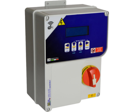 Пульт поставляется в корпусе из самогасящегося термопластика IP 55 и содержит электронную плату, которая обеспечивает регулировку тока срабатывания защиты от перегрузок и короткого замыкания и контролирует значение cos, чтобы предотвращать работу электронасоса всухую без применения датчиков уровня. Рассчитан на подключение поплавка (или реле давления и т.п.).